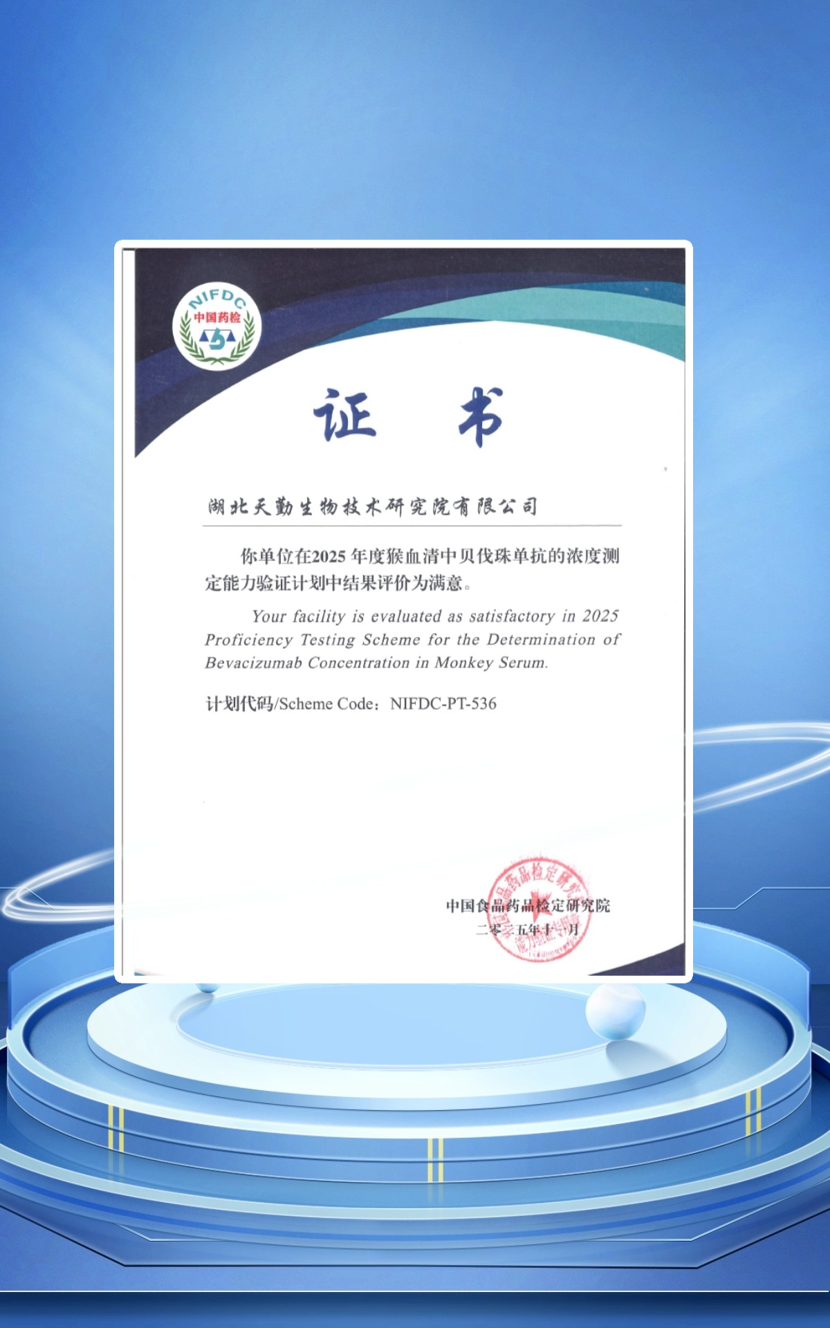 近日,天勤生物核心研發機構天勤研究院(以下稱“天勤研究院”)在中國食品藥品檢定研究院(以下稱“中檢院”)組織開展的 “2025年度猴血清中貝伐珠單抗的濃度測定能力驗證”(計劃代碼:NIFDC-PT-536)中,全部樣本檢測結果準確,結果評價為 “滿意”。